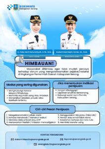 Masyarakat dihimbau agar tidak mudah percaya terhadap oknum yang mengatasnamakan pejabat/instansi di lingkungan Pemerintah Daerah Kabupaten Serang. baca selengkapnya 👉 “Mari bersama-sama lawan penipuan dan
